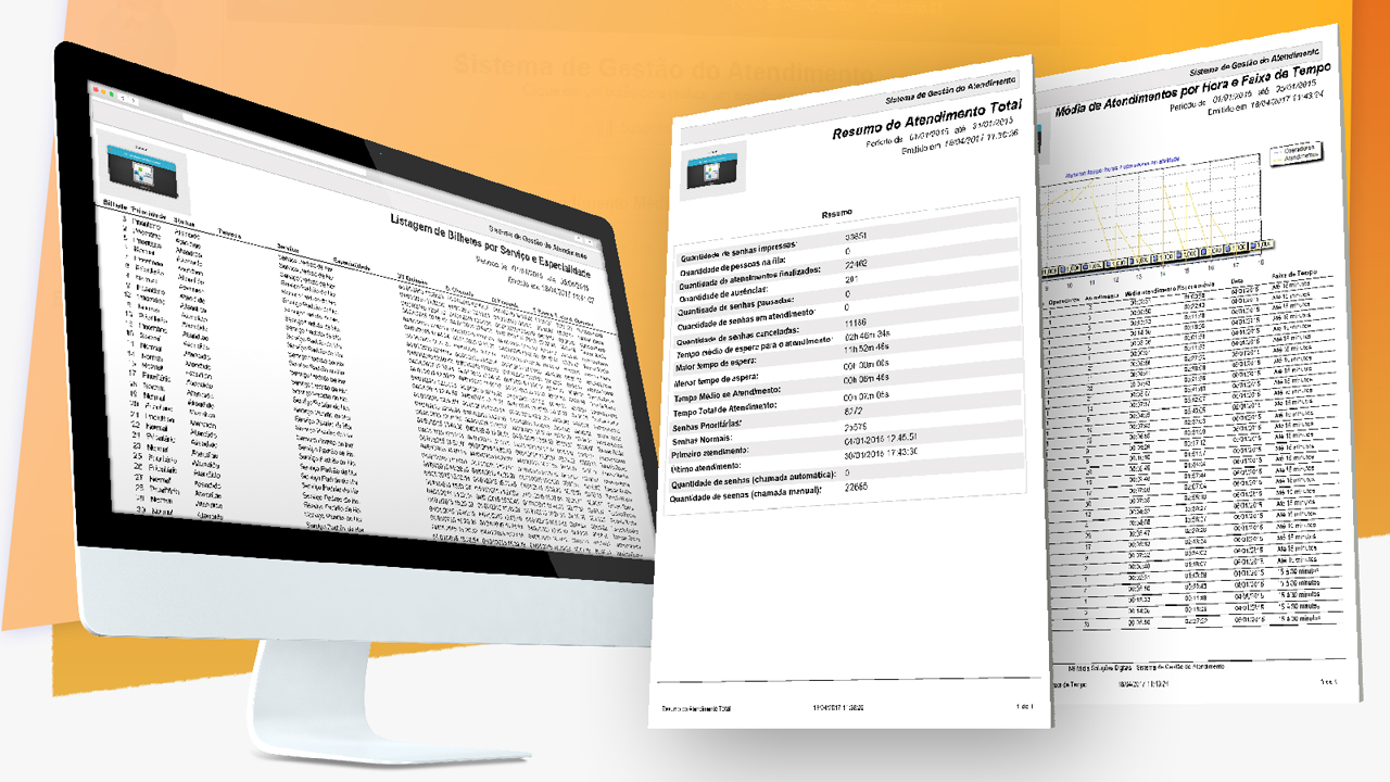 Visualização de relatórios gráficos com informações gerenciais e estatísticas (média, mínimo, máximo, entre outros) sobre todo movimento no atendimento. Todo o histórico do atendimento fica armazenado no sistema para fazer qualquer tipo de mineração para auxiliar no processo de tomada de decisões. Granularidades como hora, data, senha, atendente, serviço etc são alguns dos dados de entrada para extração de relatórios no sistema.